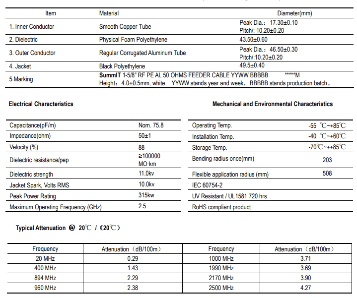The high-quality 1-5/8″ feeder cable incorporates high-foam polyethylene insulation technology to minimize signal loss and has excellent electrical characteristics such as low damping and reflection coefficient.